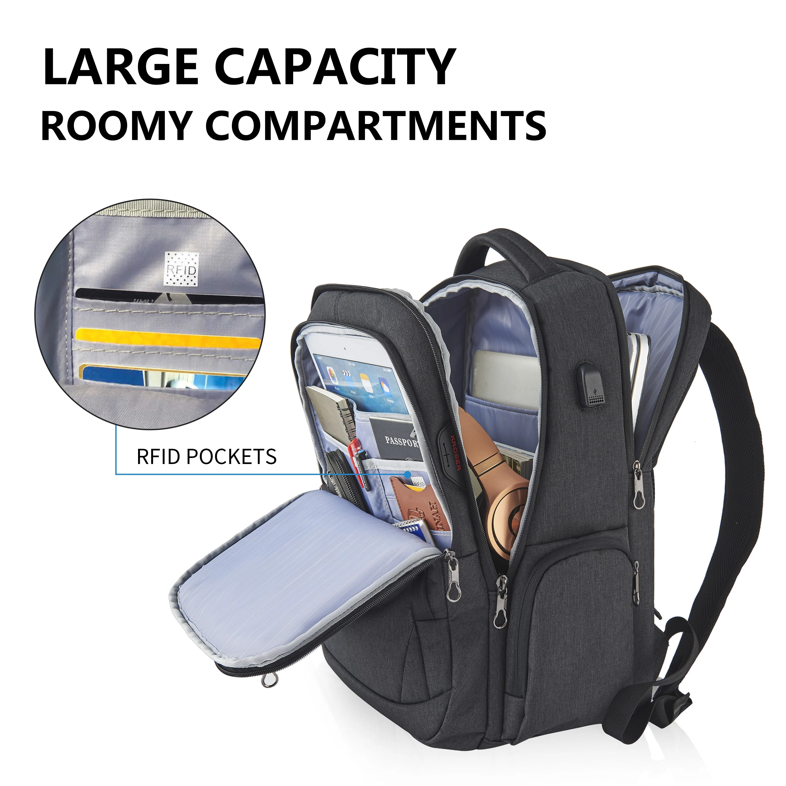 - MULTI-FUNCTIONAL COMPARTMENTS: Separated compartments and pockets are designed to provide roomy space for your computer, iPad, power bank, A4 files, wallet, pens, cards, clothes, etc. Well-padded foam for your computer with organizer dimensions fits up to 17.3 inch laptop. RFID Pockets with Identity protection function protects date encoded on most IDs, credit cards and passports.